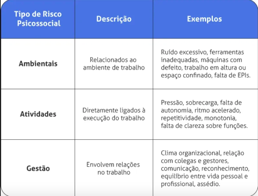 Os riscos psicossociais no trabalho podem ser gerados por uma série de fatores. Eles podem ser divididos de três formas, como mostra a tabela abaixo.